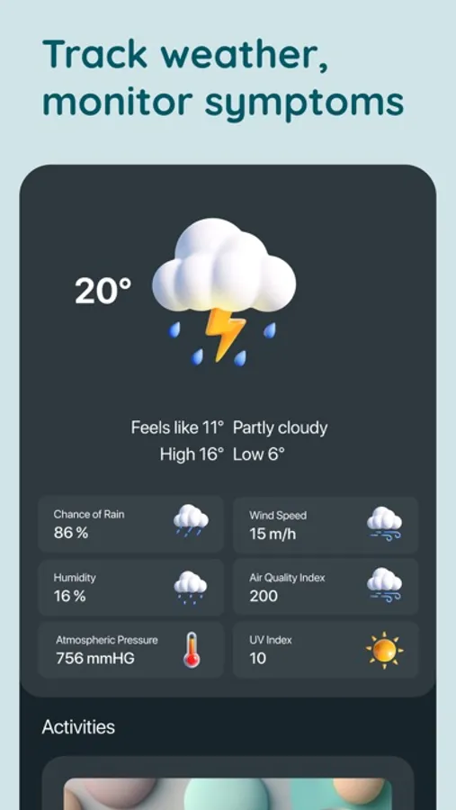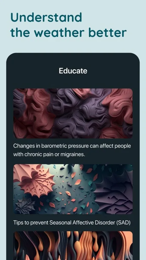 WeatherMind helps you understand the impact of weather on your health. With personalized weather forecasts, self-assessments, and journaling, our app helps you take control of your well-being.