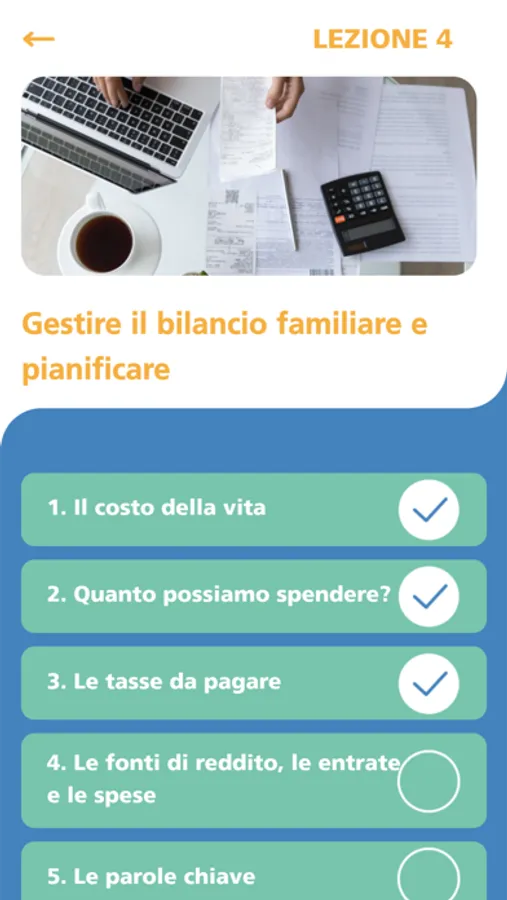 Ogni lezione propone tre dialoghi da ascoltare, in cui vengono presentate situazioni di vita quotidiana, e alcune attività interattive autocorrettive che spiegano i concetti chiave dell’educazione finanziaria.