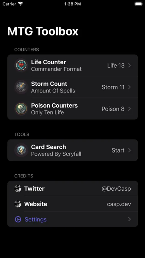 I created this app to help Magic players keep track of their life total, storm count, and poison counters. If you don't know what a card does you can use the advanced card search feature to find the oracle text and price of any card you desire. MTG Toolbox is made for competitive MTG rounds where you need to keep track of numbers but you don’t have enough dice or other physical counters while you are trying combo off.