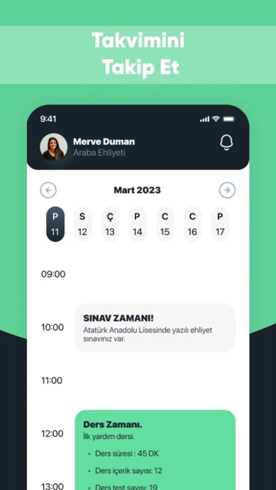 Ehliyetim Yanımda App ile kayıtlı olduğunuz sürücü kursu adına kullanırsınız. Sürücü kursunuzda bulunan eğitmenlerle yazışabilir, direksiyon dersleriniz için randevu alabilir bunun yanında sürücü kursunuzdaki eğitim takvimini takip edebilirsiniz.