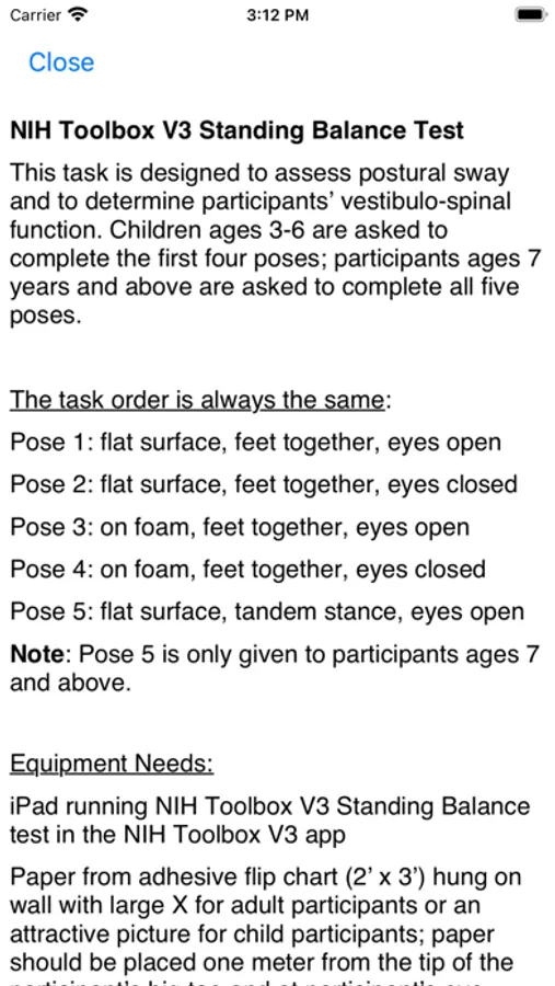 This supplemental app is intended to be used in conjunction with the NIH Toolbox V3 Standing Balance test. The Standing Balance test is available in the separate “NIH Toolbox V3” app.