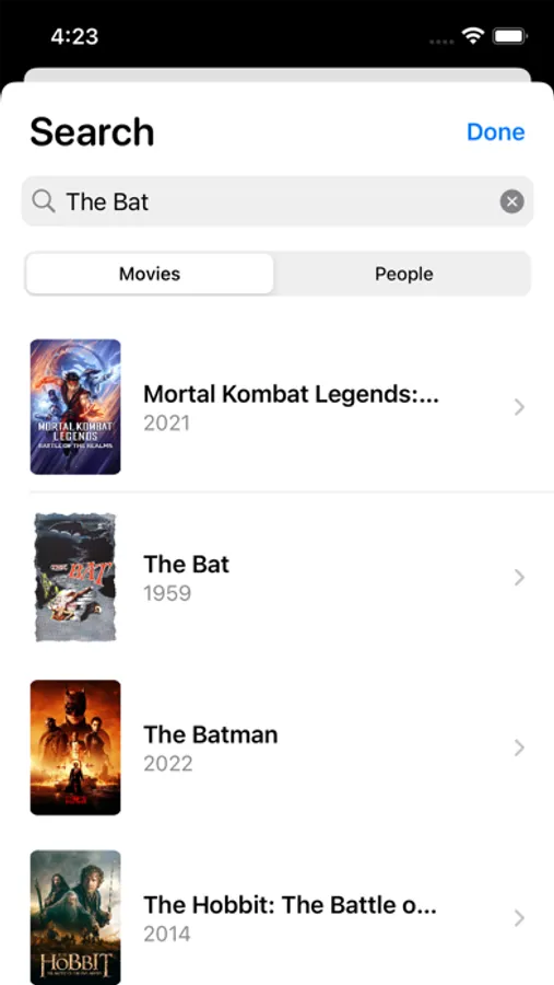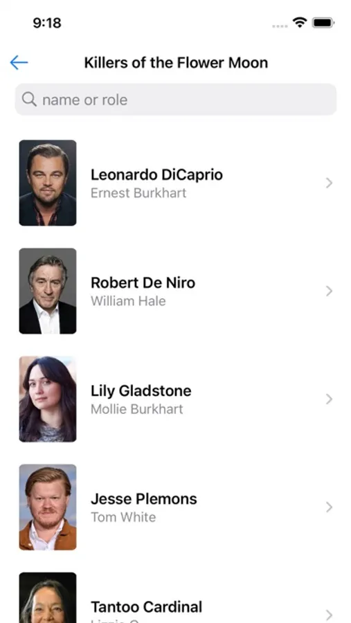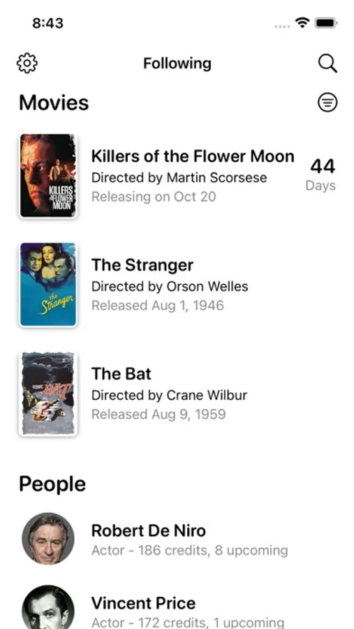 - Search for people (cast & crew) and see what upcoming and released movies they are attached to.
