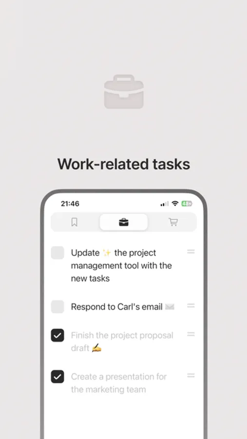 - Three dedicated tabs: Personal, Work, and Shopping, for effective task categorization