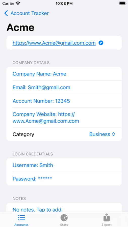 Comprehensive Account Tracking: Store and manage all your account information, including company name, website, email, account number, username, and password. Add as much or as little information as you want to keep everything organized.