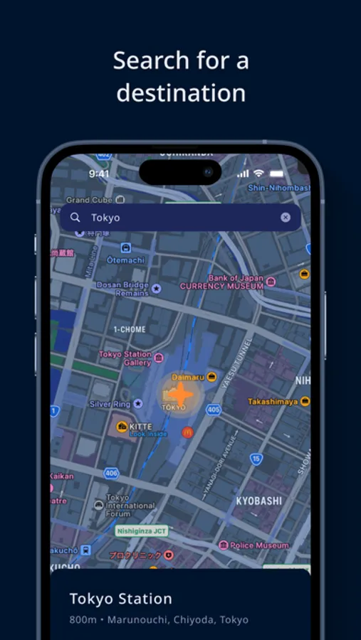 By pinching in on the screen, you can get an overview of your destination, starting point, and your own location. You can see your location and the location of your destination at a glance.