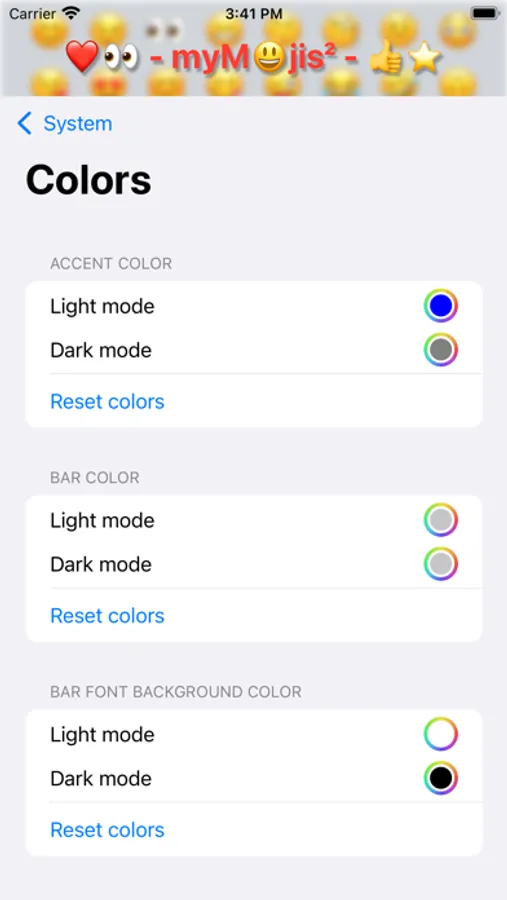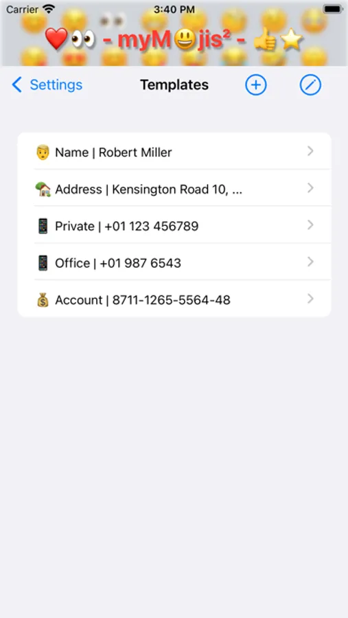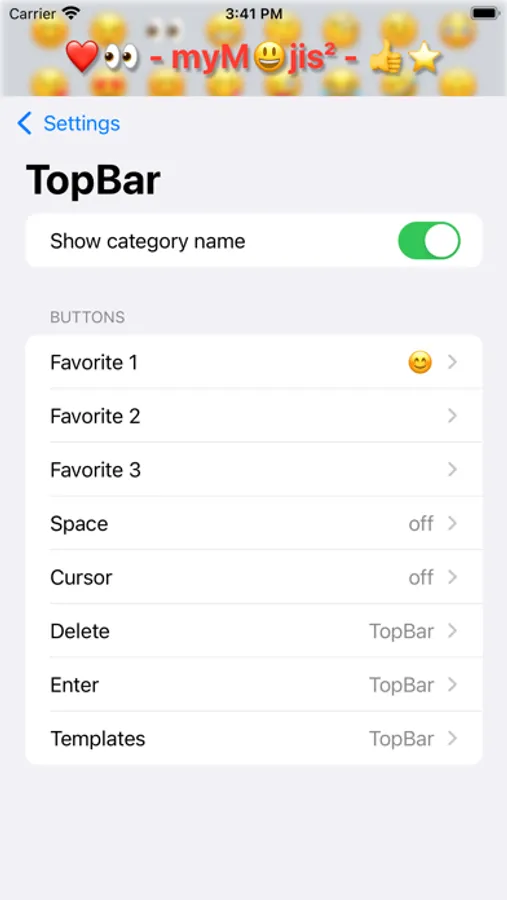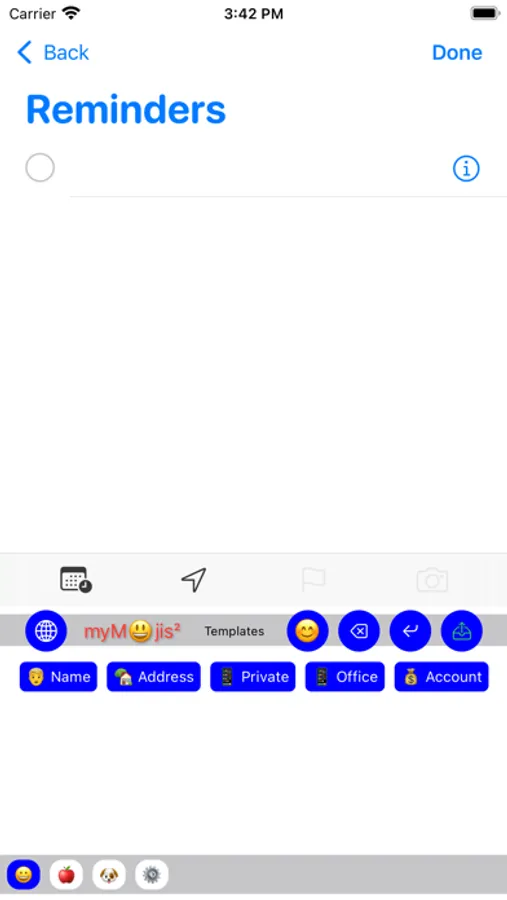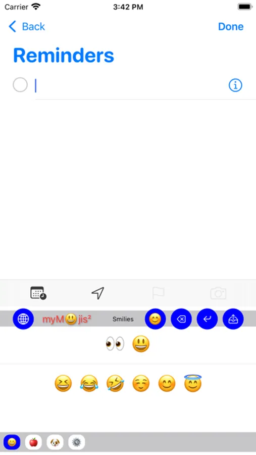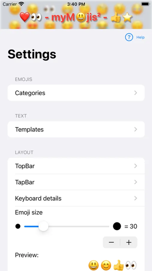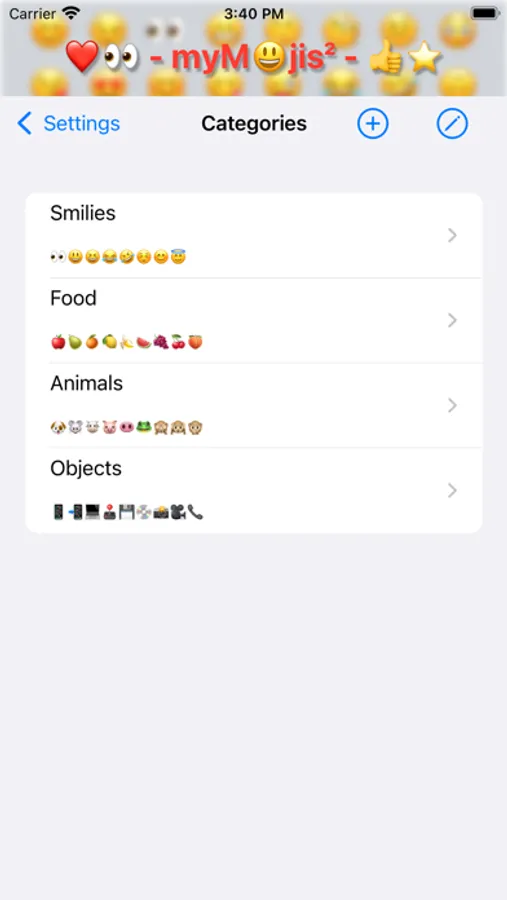 myMojis is an additional emoji keyboard where you can create your own categories/groups, in which you can place any emoji you want. They can be arranged in any order and also be separated by a line break. So you can access them from anywhere in a quick way. You can also create text-templates to increase your typing speed.