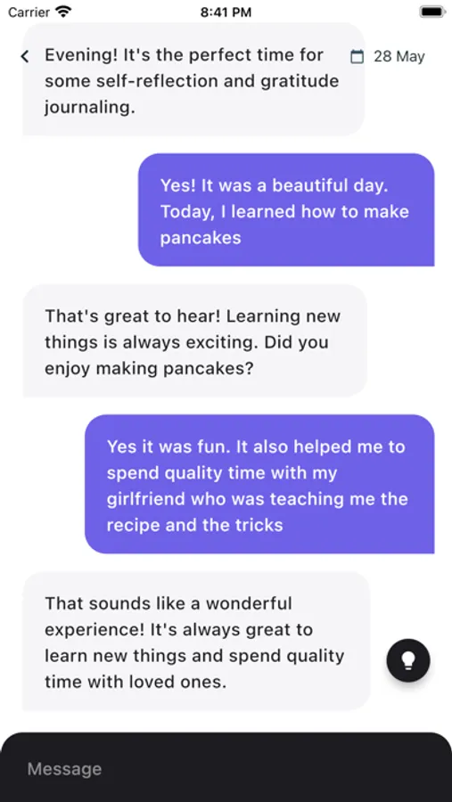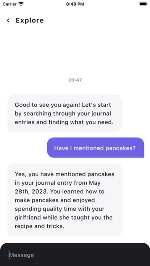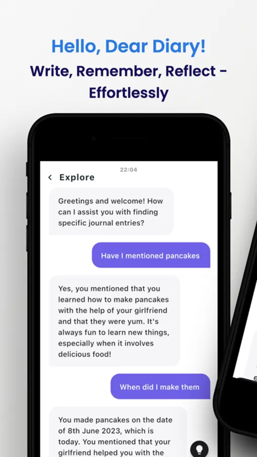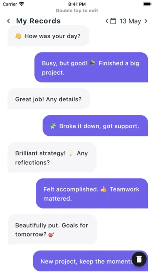 Our app transforms your introspective moments into a delightful chat with your past self. Featuring a cutting-edge GPT model finely tuned for seamless interaction, it allows you to pen your daily entries in a familiar texting format.