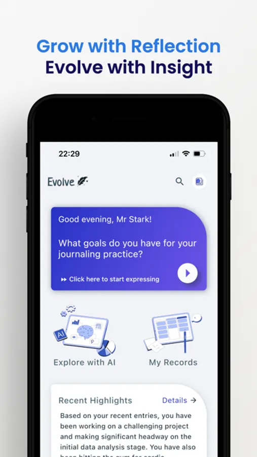Welcome to Evolve: AI Journal, the revolutionary AI-powered tool that turns self-reflection into an engaging conversation. With Evolve, you're not just filling in a diary; you're engaging in a dialogue with your life.