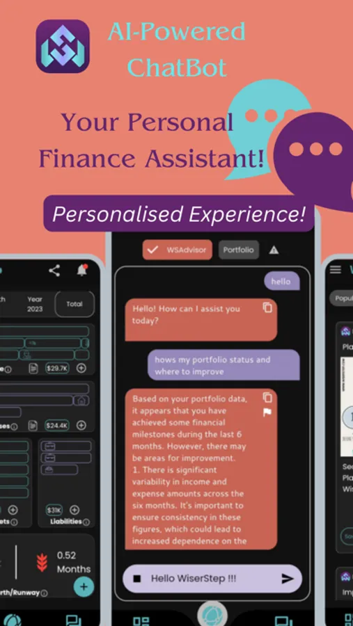 WiserStep goes beyond traditional finance apps by incorporating artificial intelligence. Our AI chatbot offers two distinct bots to enhance your financial management experience. The first bot is dedicated to portfolio management, allowing you to effortlessly register entries and track your financial progress. The second bot serves as a general finance advisor, providing insights and suggestions to help you make informed decisions. Please note that while the finance advisor bot is powered by generative AI, we encourage users to rely on verified sources for critical financial advice.