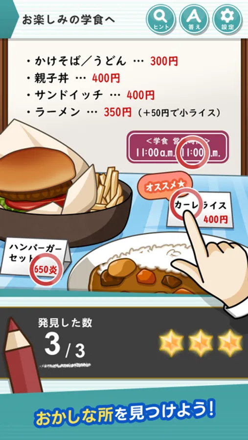 ・ステージ毎に3~5個のおかしな部分をみつけてタップしましょう。