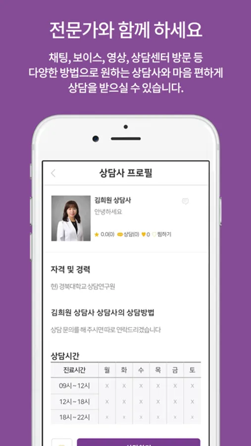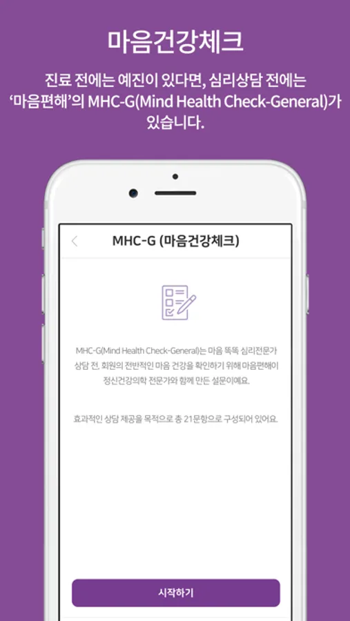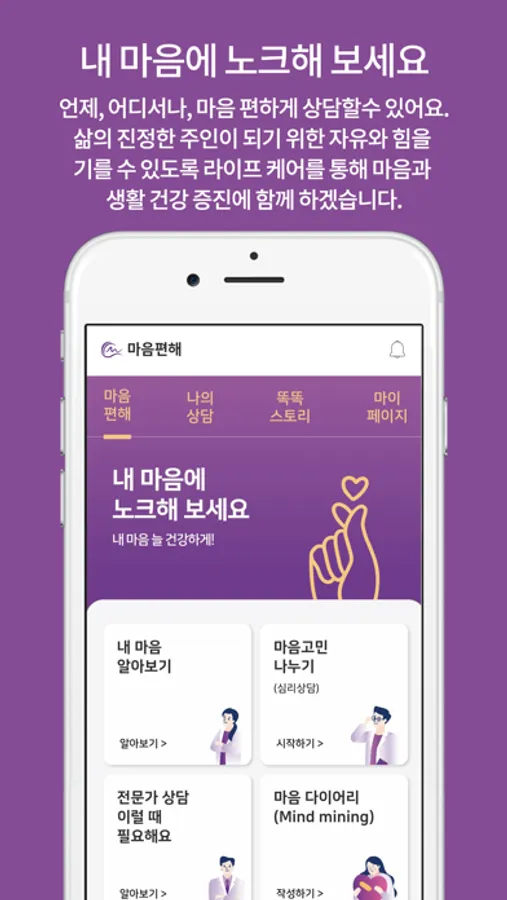 마음편해 앱은 심리상담을 위해 심리상담 전문가와 사용자를 연결해주는 앱입니다.