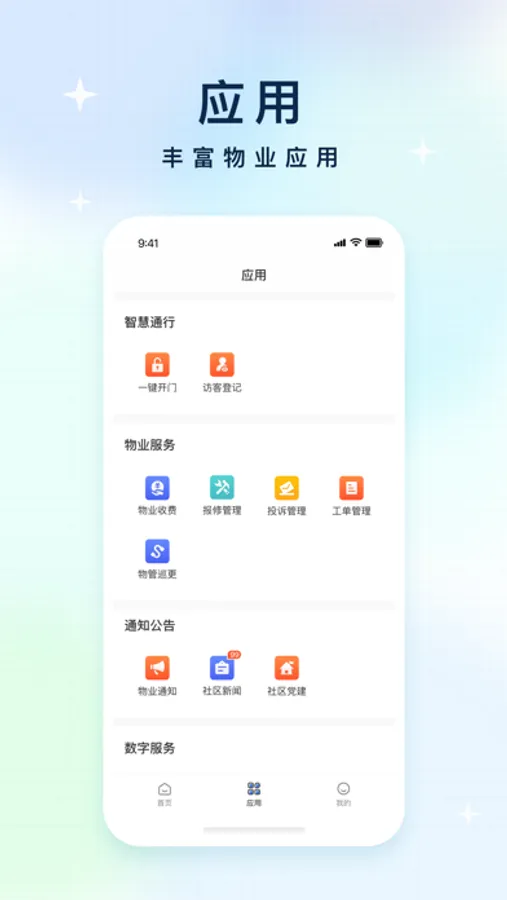 中铁智慧生活物业版,是基于中城数字社区运营管理平台构建的数字社区服务类应用,为中铁集团下属小区的物业公司管理和服务人员提供智能化、数字化的服务和管理工具。 物业APP的使用对象主要包括:物业公司的管理和工作人员、物业外协合作单位工作人员。 中铁智慧生活-物业APP提供的应用包括:人员通行、物业巡更、报事报修处理、投诉业务处理、物业收费、安防告警、社区新闻和公告管理等。