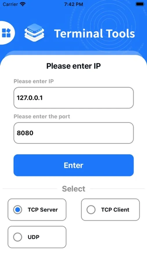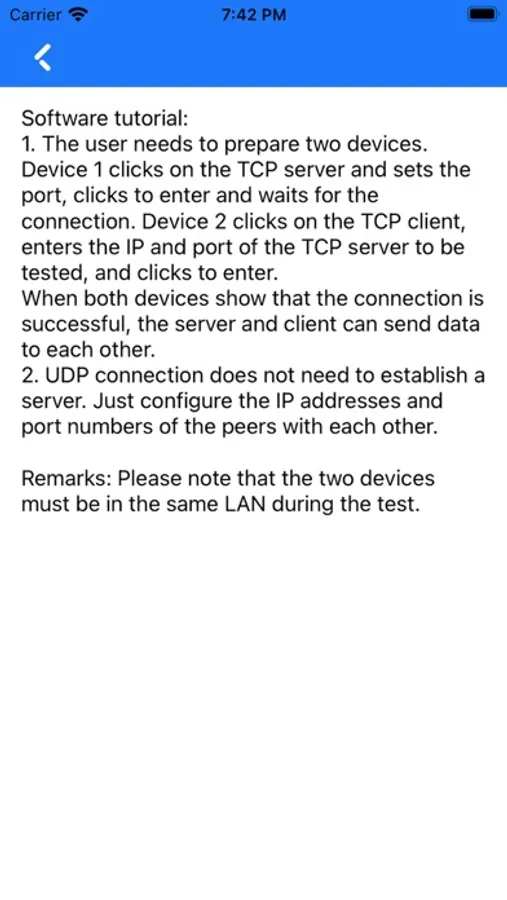 1. The user needs to prepare two devices. Device 1 clicks on the TCP server and sets the port, clicks to enter and waits for the connection. Device 2 clicks on the TCP client, enters the IP and port of the TCP server to be tested, and clicks to enter.
