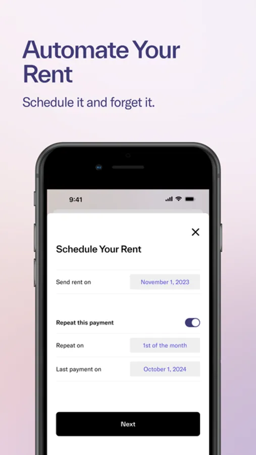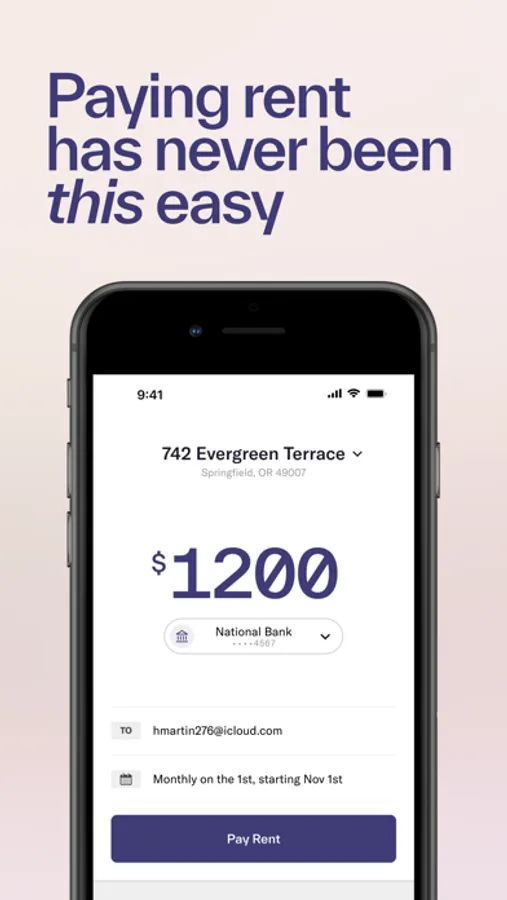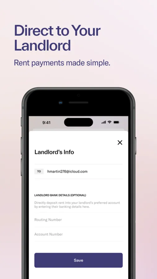 Enter your rent amount and the landlord’s phone number or email. You can add their routing and account details if you have them. Choose a payment date and tap Pay Rent.