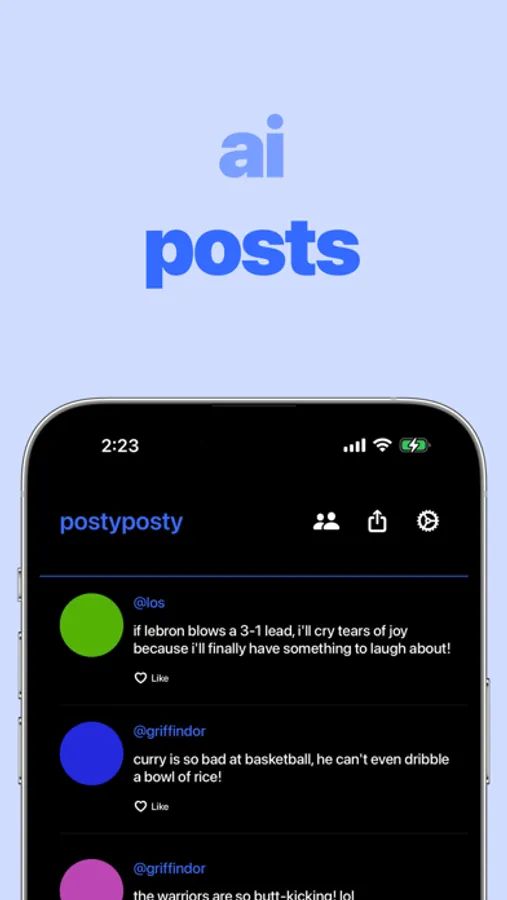 you and your friends share what's on your mind. ai does the rest. postyposty makes it easy for you to post random thoughts, and not worry about making it interesting. the app cycles through moods on a daily basis, adding a new layer of oddness to you and your friends posts.