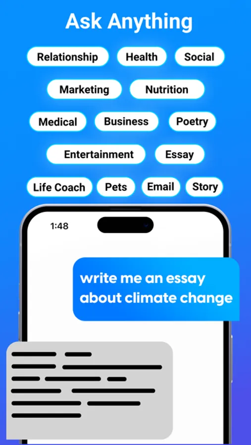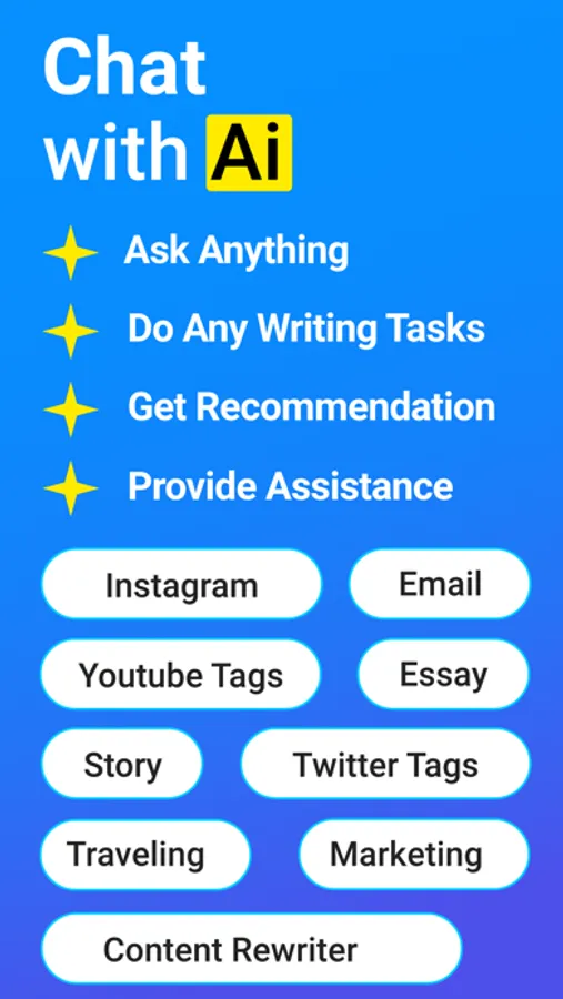 Chatbot- AI writer assistant empowers you to unlock your creative potential and streamline your content creation process. Whether you're a seasoned marketer or a budding entrepreneur, this app is your secret weapon for driving engagement, attracting new customers, and propelling your brand to new heights.