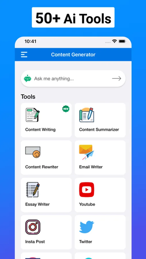 With Chatbot- AI writer assistant, the power of artificial intelligence is at your fingertips, enabling you to effortlessly create engaging and impactful content in just a few taps. Say goodbye to writer's block and hello to limitless possibilities.