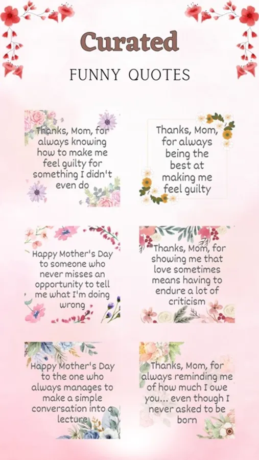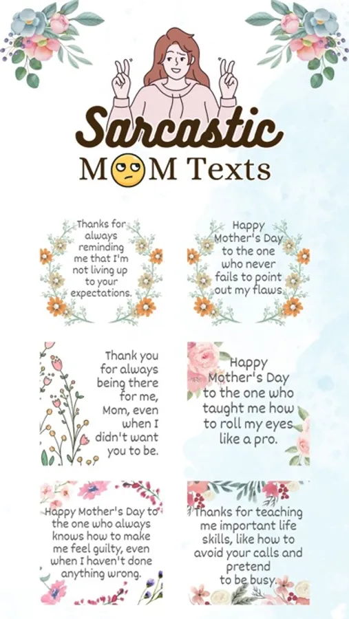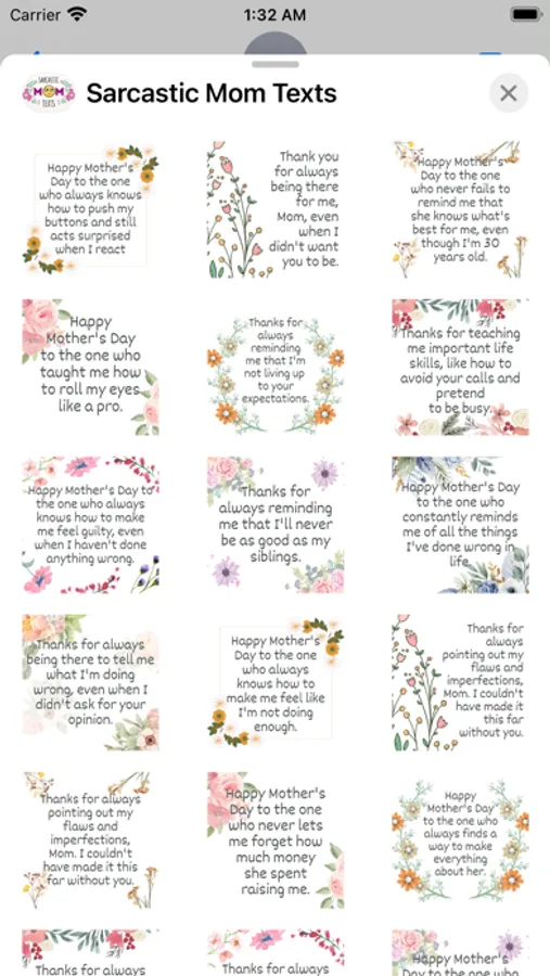 Looking for a fun and sarcastic way to celebrate Mother's Day? Check out our hilarious Mother's Day sticker pack! Featuring 50+ short jokes, floral greetings, and quotes, our sticker pack is the perfect way to add some humor and wit to your iMessage conversations. From witty one-liners to clever quips, our stickers will have you and your mom laughing out loud. So why settle for a boring Mother's Day message when you can spice things up with our fun and jokes sticker pack? Download now and let the laughs begin!