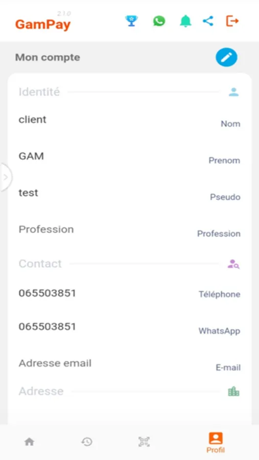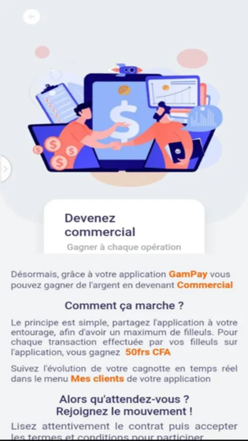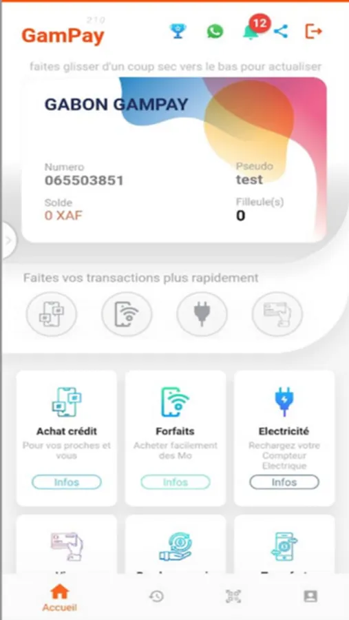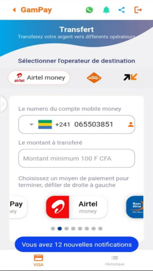GamPay est une application qui permet de faire des recharges visa même à l'international, mais aussi de recharger son compte mobile money via les différents moyens de paiement local. Elle permet également d'acheter du crédit d'appel et du forfait.