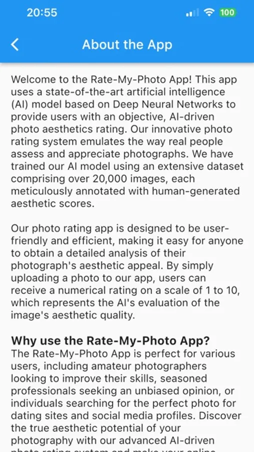 Discover the secrets of stunning photography with Rate My Photo! Our app uses AI technology to rate your photos' aesthetics, offering feedback to help you improve your skills. Whether you're a beginner or a seasoned photographer, Rate My Photo is your go-to app for elevating your images. Upload or capture photos directly in the app, and let our AI guide you towards picture-perfect moments. Download Rate My Photo now.