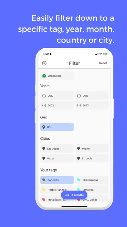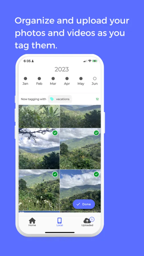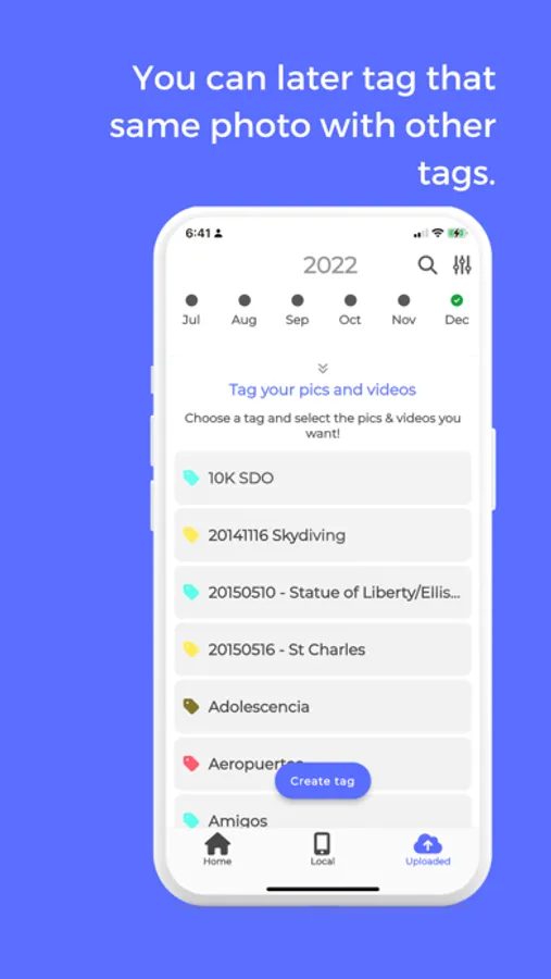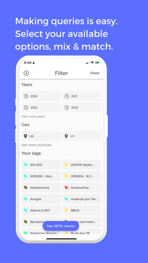 As you tag, that photo or video is also automatically uploaded to our cloud and tagged with location (country, city) and date (month, year). You can later tag that same photo with other tags. Making queries is as easy as selecting your available options (tags, locations, dates) and mix & match. Duplicated photos are deleted, so storage is optimized. You can create shortcuts to quickly access any query. Access those photos and videos in seconds with one tap. See and share those pics and videos to Whatsapp, email, etc.
