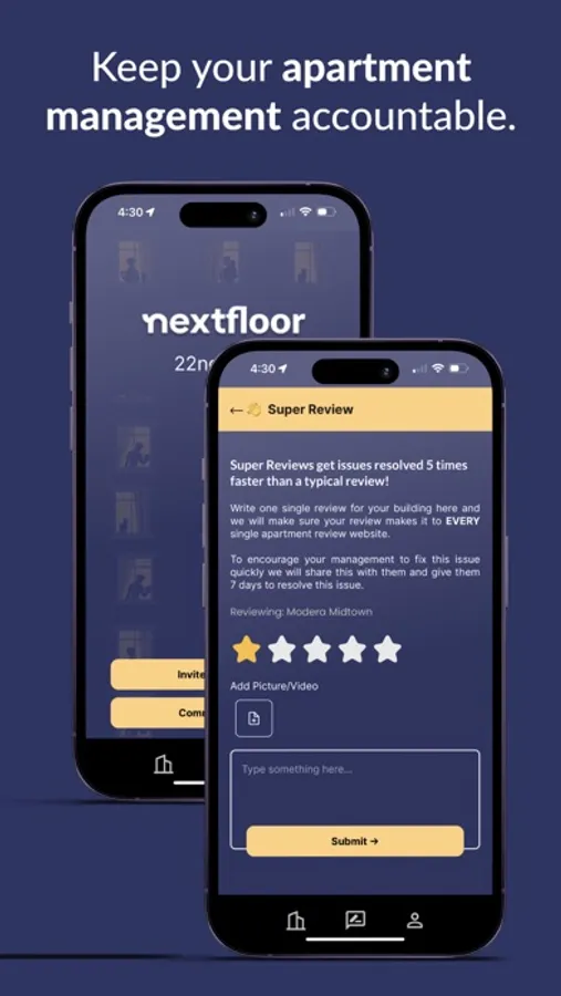 Nextfloor is the ultimate anonymous apartment community app that keeps your apartment managers accountable when things aren’t being handled in your building!