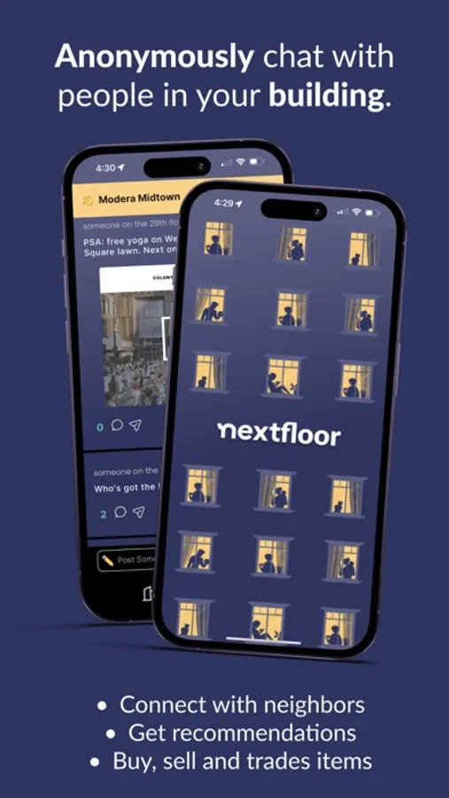 Nextfloor is built on trust and privacy. We ensure you're connected to real residents in your building while maintaining your anonymity. Sign up with a unique username and start connecting with your apartment community today!
