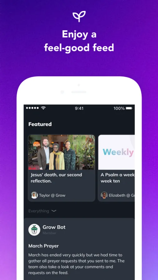 On Grow, you can find a feed full of goodness as our hosts and members share encouragement, truth, and scripture. Not to mention interactive workshops, Bible study courses, and even a prayer space. Our team are ready to stand with you in prayer.