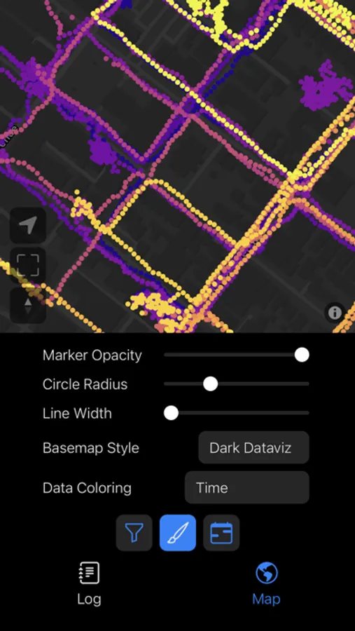 · Data colormapping for speed, course, accuracy, time, altitude, etc.