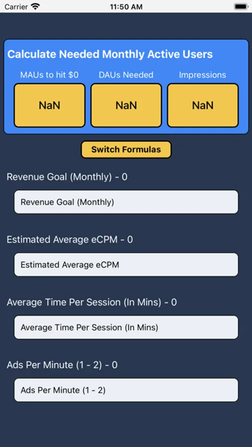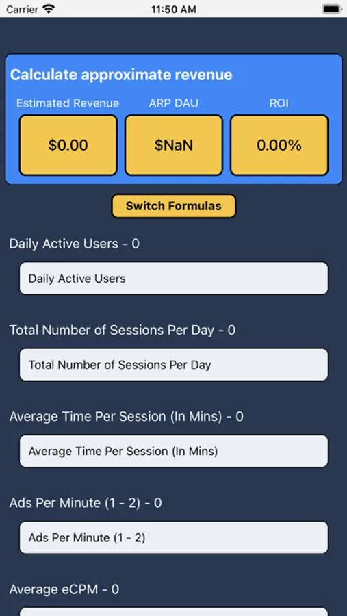 Ad Revenue Calculator is an easy-to-use revenue calculator for your apps and websites that utilize services like Google's Admob for revenue. Need to forecast your expected earnings? Simply fill in the fields and see what you can expect to earn! Want to know how many users you need to make a certain amount of revenue each month? Our app can help you there as well!