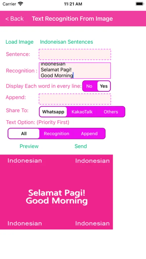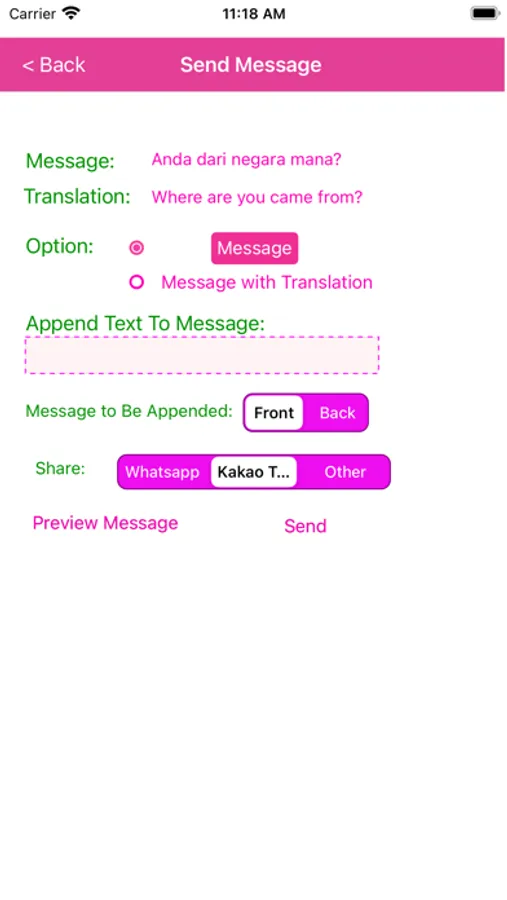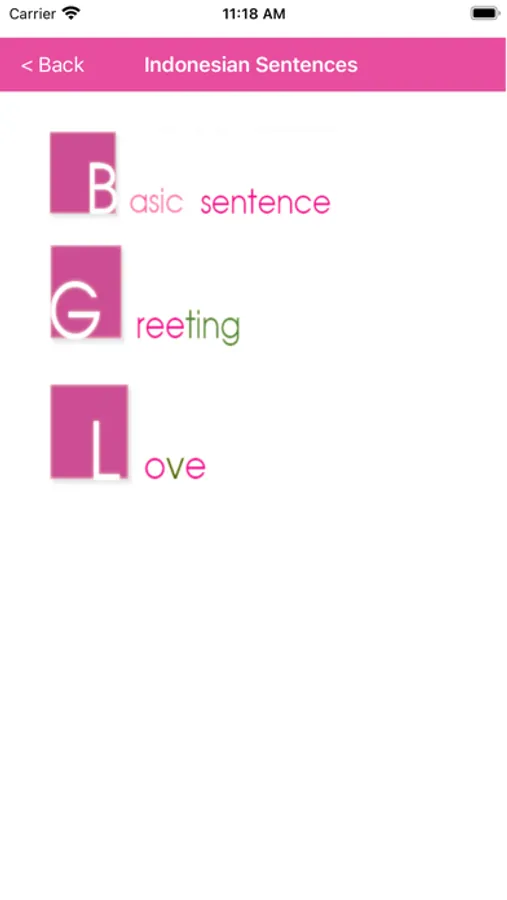 There are three categories which allow user to send messages in Indonesian such as basic sentences, greeting and love.