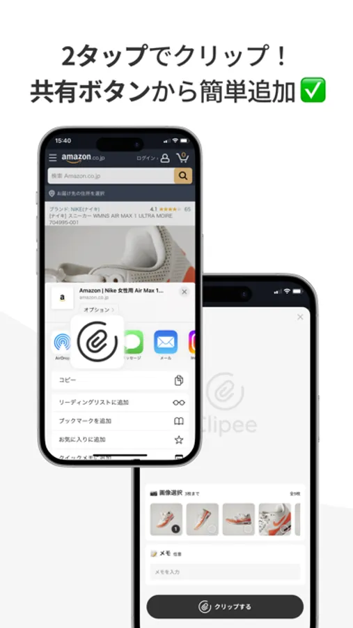 ・ブラウザやアプリの共有ボタンから2タップで簡単にクリップできます。
