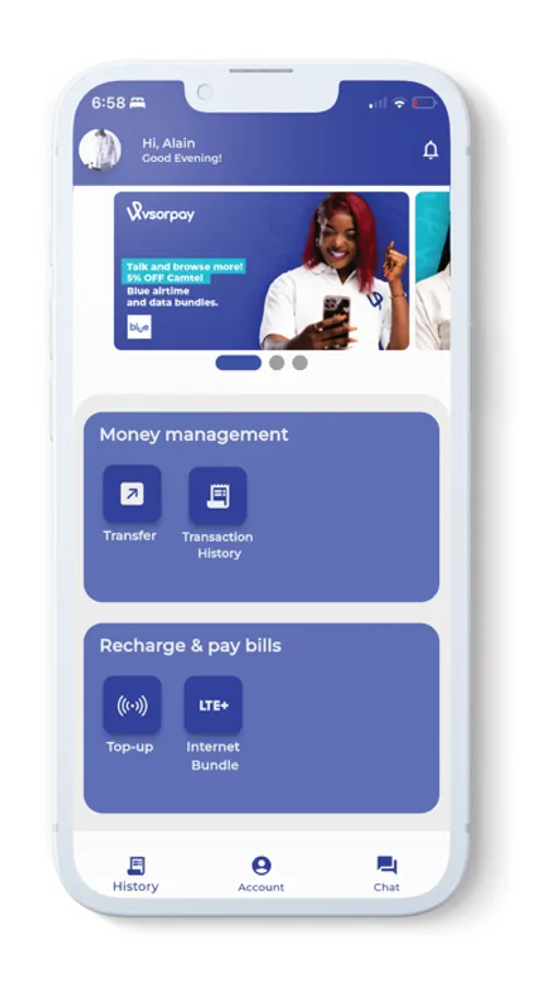 Welcome to Vsorpay; the first super-app in the CEMAC region. With Vsorpay, we are connecting you to the financial world where you can send money to friends and family, top-up airtime, purchase data bundles, pay your bills, create merchant accounts, and much more.