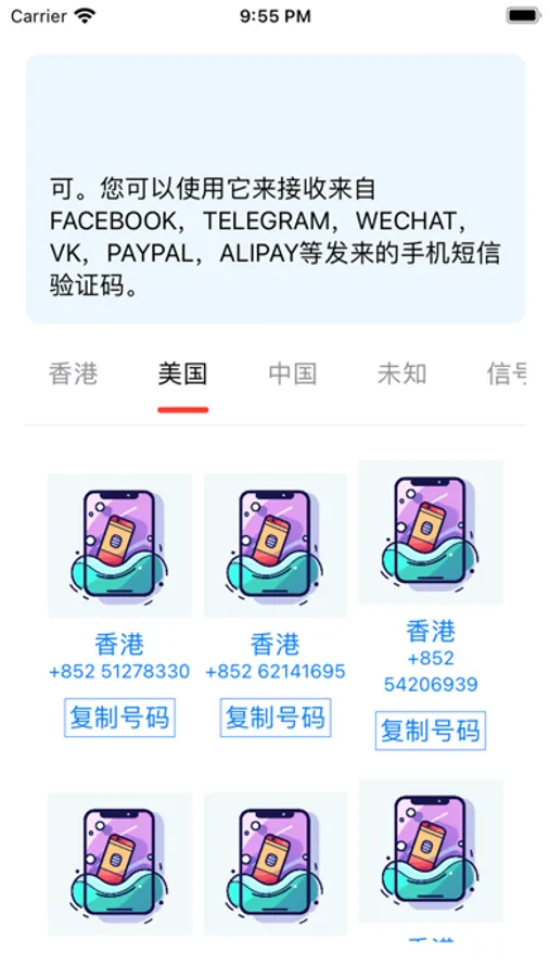 用于在线接收手机短信验证码。不需要注册。只需从下面的列表中选择您的电话号码即可。您可以使用它来接收来自FACEBOOK,TELEGRAM,WECHAT,VK,PAYPAL,ALIPAY等发来的手机短信验证码。