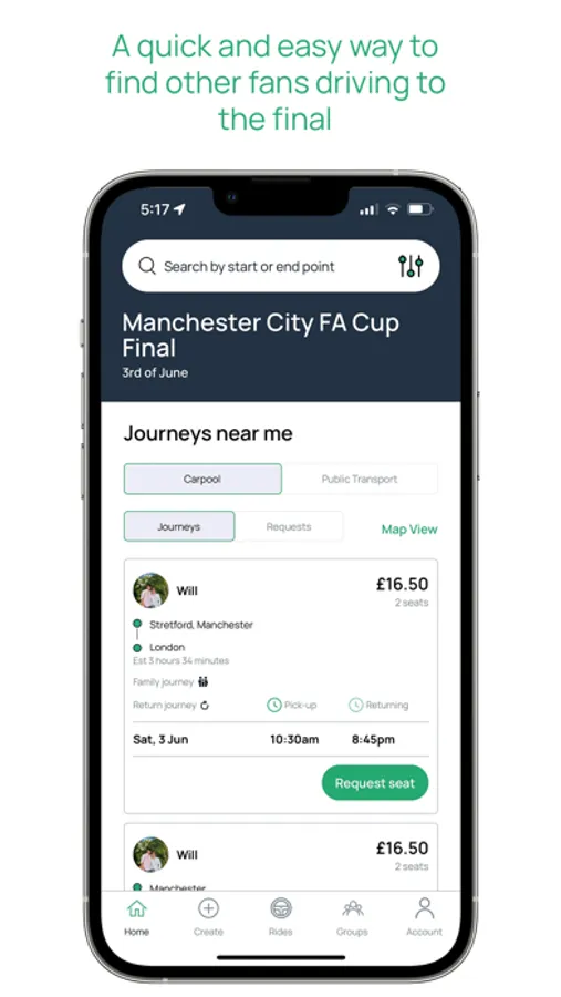 This is an app built by fans for fans. With the upcoming train strikes on the day of the final, we wanted to ensure that all fans were able to travel to the final and enjoy the day. This app enables you to find other fans of your club who are driving to the game who you can share the journey with, splitting the cost of petrol. We want to create a safe, community environment where fans can connect with one another to support each other and enjoy the final as much as possible.