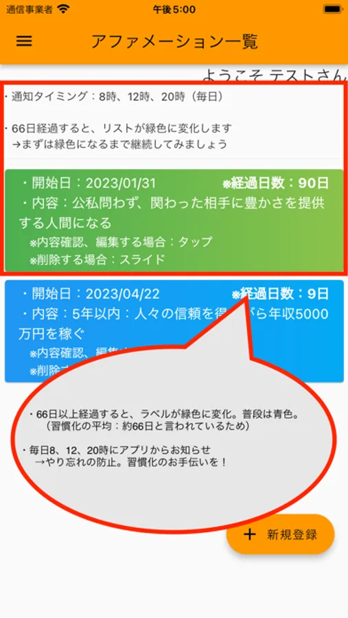 ・アファメーション一覧画面:「アファメーション内容」と「登録してからの経過日数」を表示。