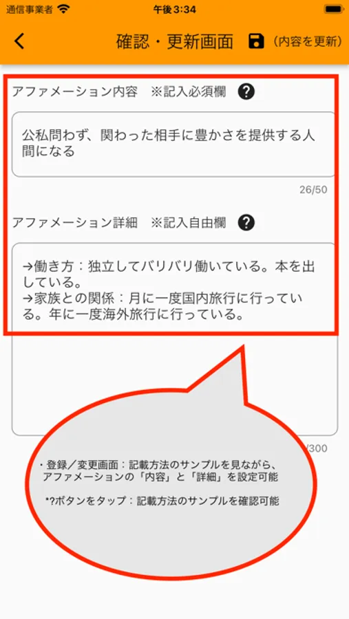 ・登録/変更画面:記載方法のサンプルを見ながら、アファメーションの「内容」と「詳細」を設定可能