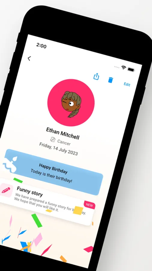 Our most entertaining feature is providing personalized funny stories on the birthdays of your added contacts. Our AI-powered system creates unique and enjoyable stories for each birthday.