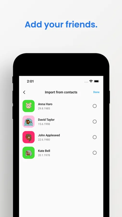 Easily add birthdays from your contacts or calendar, or manually enter them in the app.