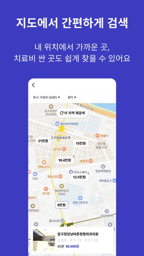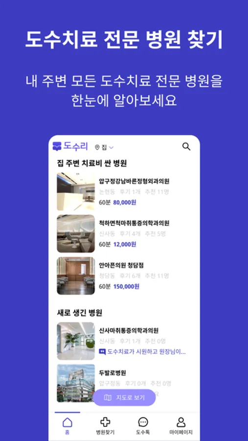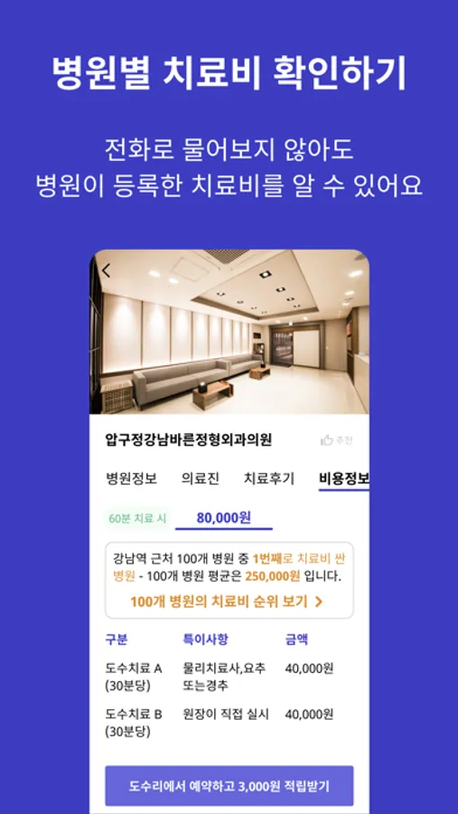 - 병원별 도수치료 가격을 비교하고 합리적으로 선택할 수 있어요.