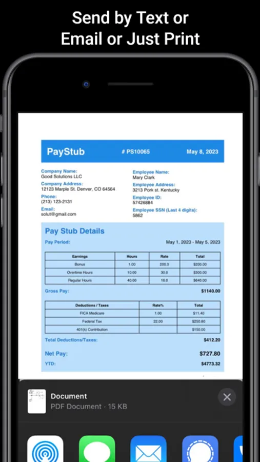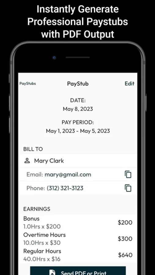 • Flexible Delivery Options: Print, download, send pay stubs by text message, or email them directly to your employees or contractors effortlessly.