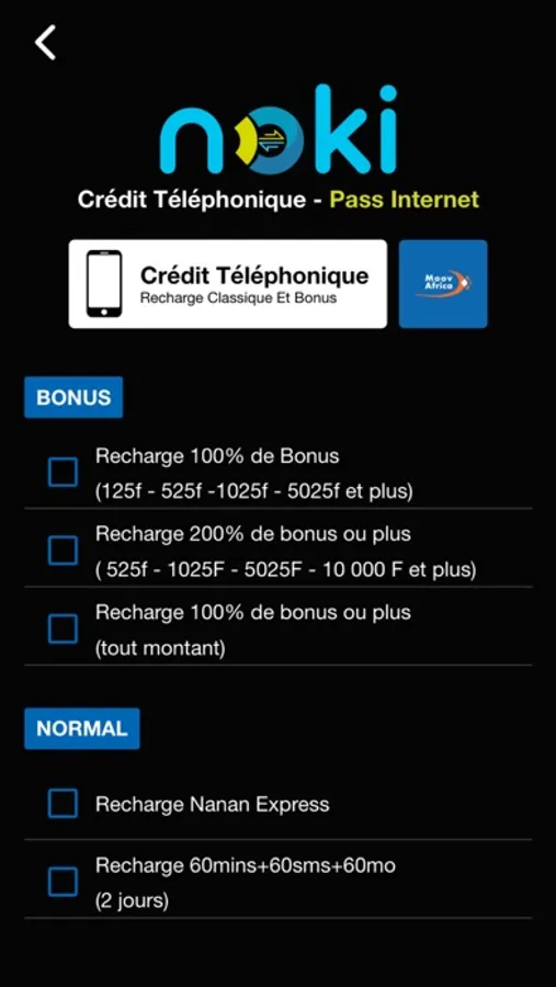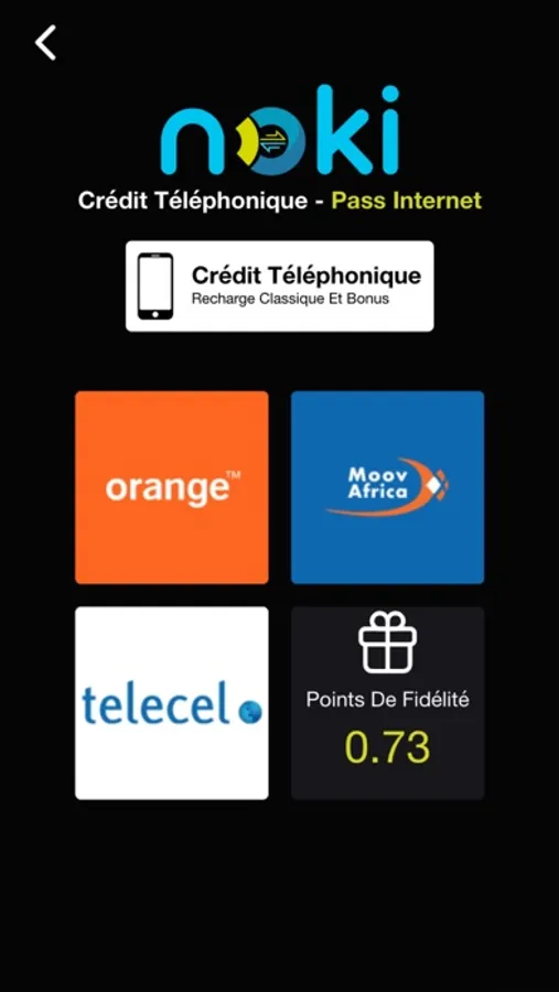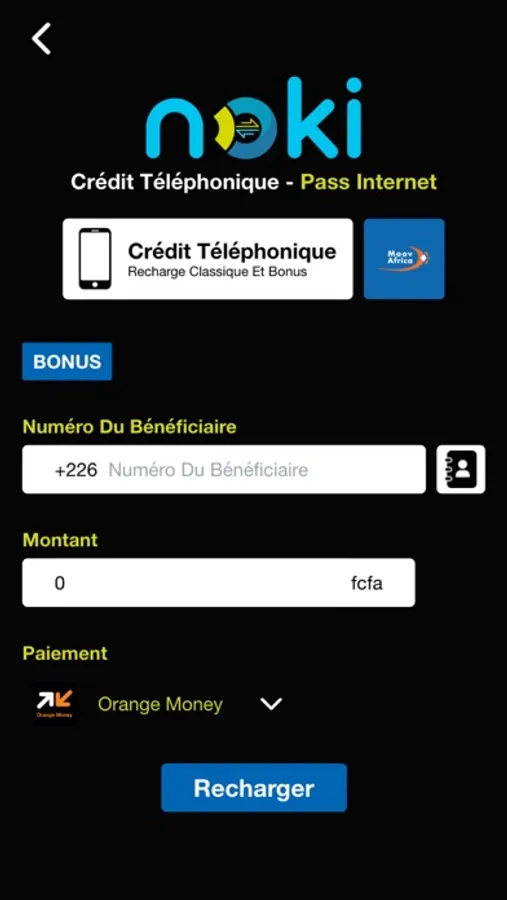 NOKI est une application mobile qui vous permet de vous recharger simplement et immédiatement en crédit téléphonique et forfait internet quelques soit l’opérateur (orange Burkina – moov Africa – telecel faso) et le portefeuille mobile (orange money – moov money).