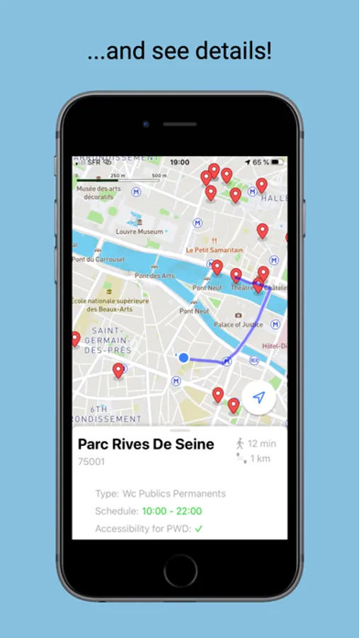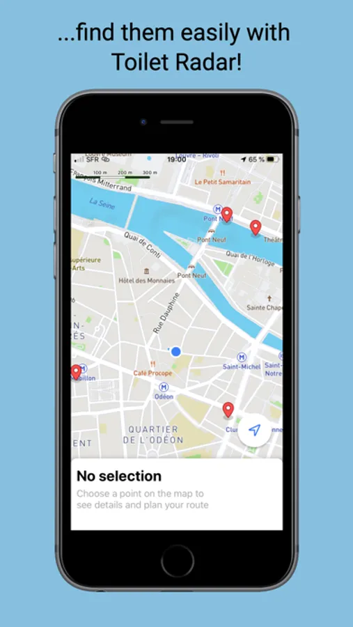 Toilet Radar is your FREE go-to app for finding a clean and convenient bathroom in Paris! With just a few taps, you can quickly locate nearby public restrooms and plan your route with a built-in navigation feature. The app also calculates the estimated time and distance needed to get to your relief.