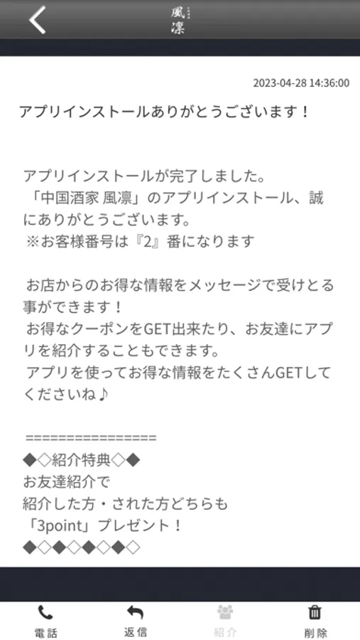 このアプリでは、フウリンの最新情報の受け取りや便利な機能を使う事ができます。