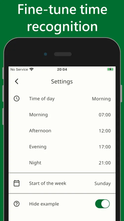 • To change the default "Time of day (Morning, Afternoon, etc.)" or "Start of the week (Sunday, Monday, etc.)", launch the "Settings" screen from the "Settings" button in the menu