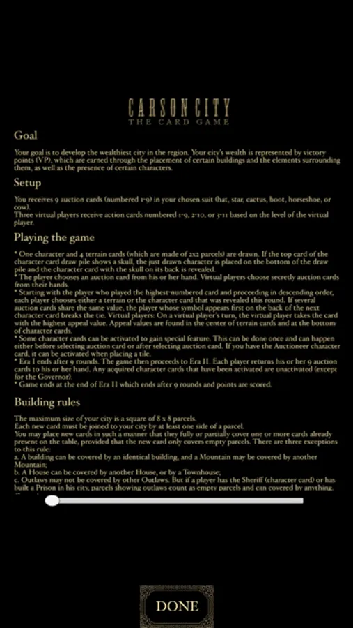 Play against three virtual players that will take the best parcels and recruit the most influential people in order to prevent from you achieving your goal. The virtual players have three levels of difficulty.