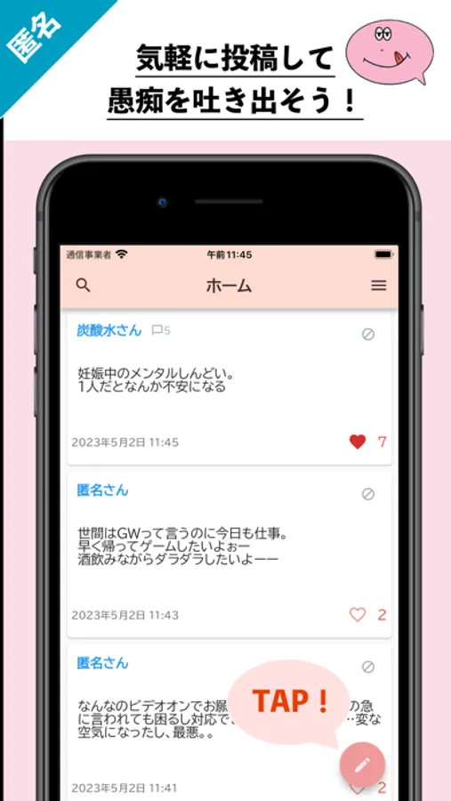・完全匿名で好きなだけ愚痴を投稿できるアプリです