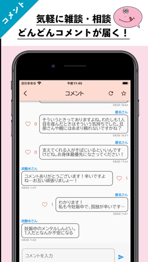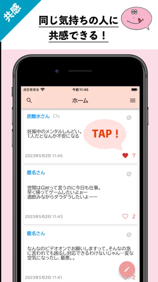 ・同じ境遇でよく分かる、頑張ってほしい、と感じる投稿には共感ボタンを押すことでその気持ちを表現することができます