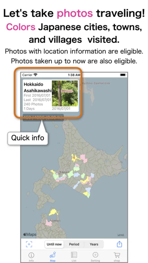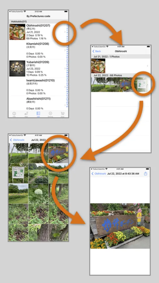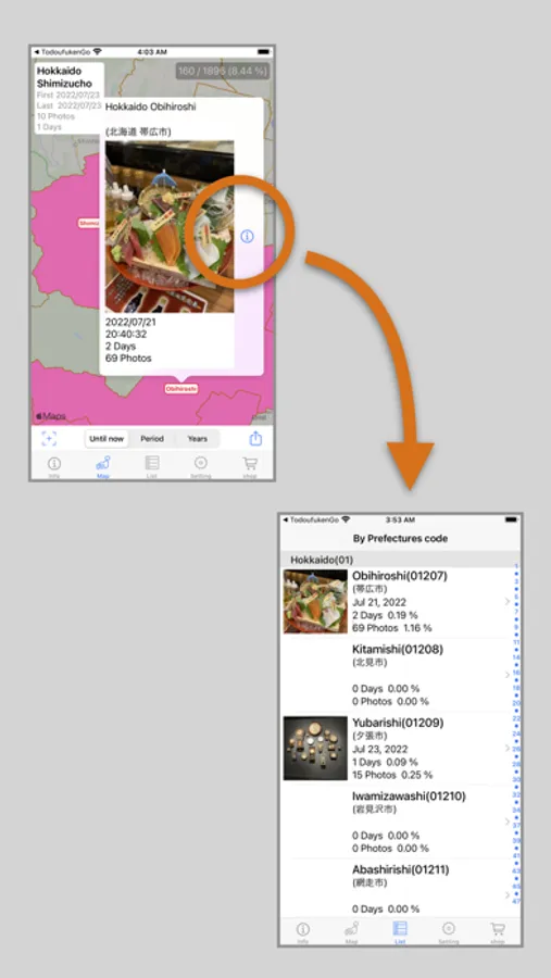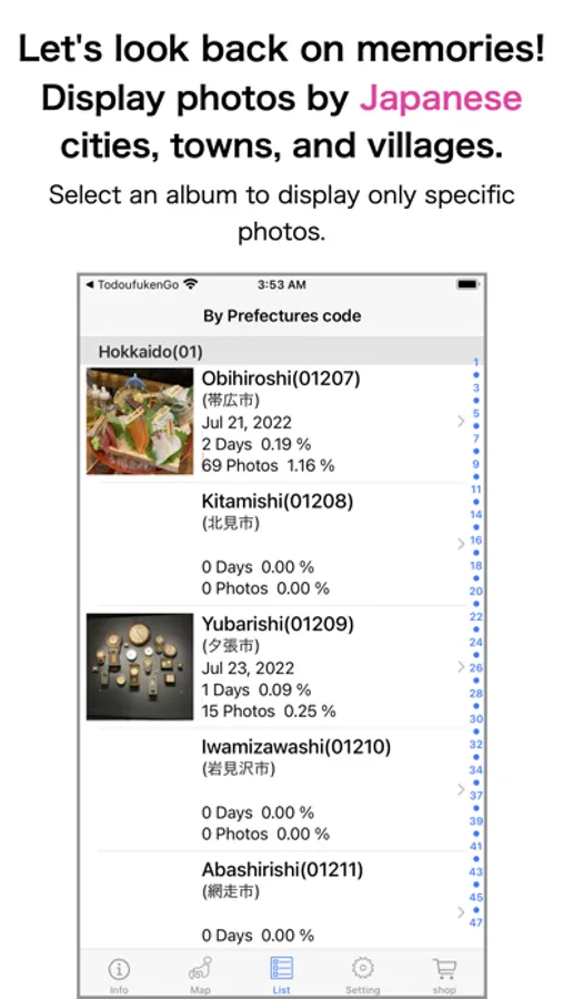 "List" photos, shooting date, number of shots, and number of days are displayed for each municipality in Japan.