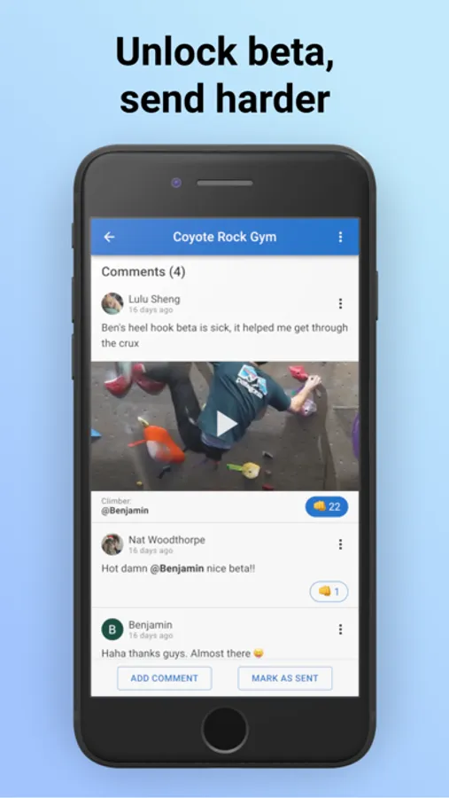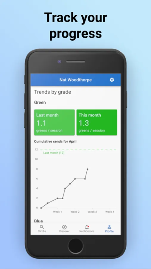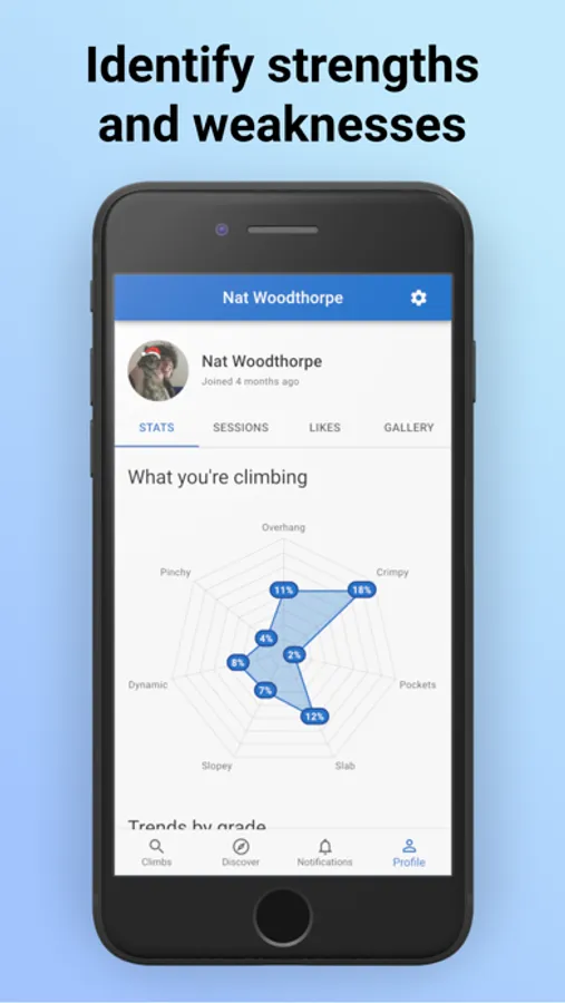 Keep track of your sends and see how you progress over time. Identify your strengths and weaknesses to help you train. See your trends over time to track your progress.